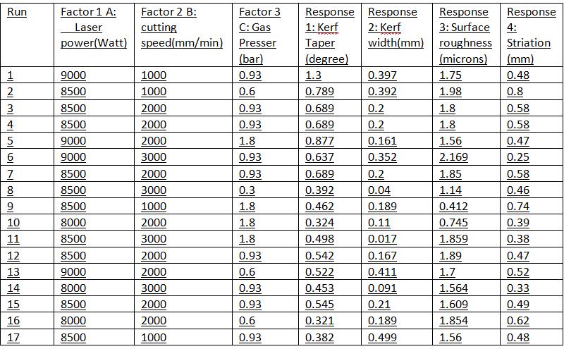 9. The final readings for CO2 Laser Cutting are as mentionintable.