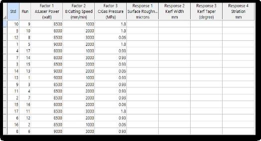 3. Design-Expert Software provided 17 runs for Fiber Laser cutting design. For the types of machining processes,theinputparameterswerechangedforevery run according to the provided design with the help of controller setup screen available for changing parametersofthemachine.