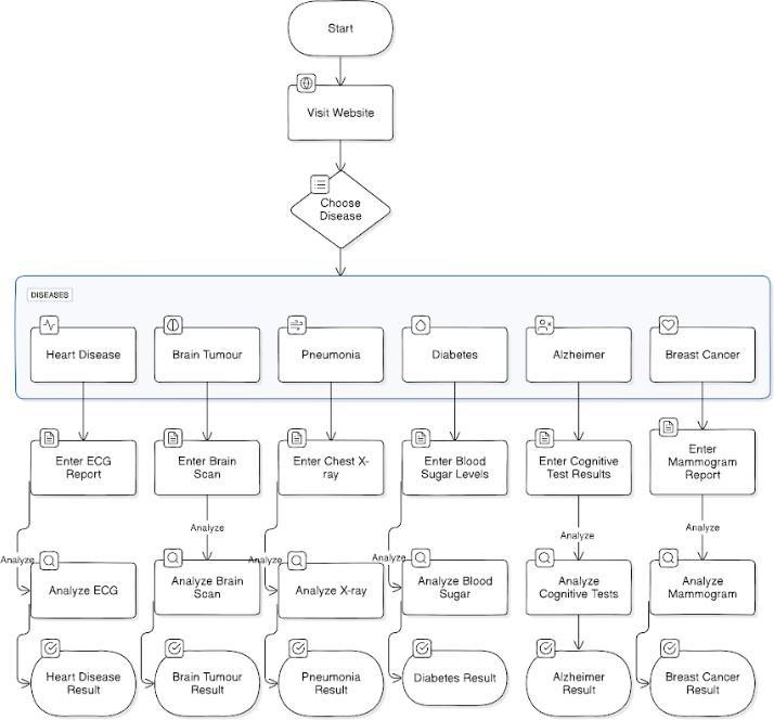CNN and machine learning algorithms were utilized in this project to train the model on the dataset and forecast the disease. WhenMRIscansorchestX-raysareusedasinputs for disorders like pneumonia, brain tumors, and alzheimer's, CNN is used to determine whether or not the patients have these conditions. To train the model for additional diseases, machine learning algorithms such as