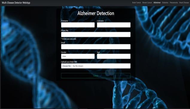 AnAlzheimer'sdetectionwebappusesmachinelearning to identifyearlysignsofthediseasefrommedicaldatasuchas MRI scans, genetic profiles, and cognitive test results. By analyzing patterns and anomalies in this data, the app can predict the likelihood of Alzheimer's, providing early intervention opportunities. The web app typically features user-friendlyinterfaces fordatainput,resultsvisualization, and reporting. It leverages algorithms like convolutional neural networks (CNNs) for image analysis and various statistical models for other data types. This tool aids healthcare professionals in making informed decisions, potentially improving patient outcomes and managing the diseasemoreeffectively.