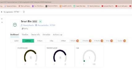 Blynk Platform for Data Visualization and Control: The Blynkplatformservesastheuserinterface,allowingusersto monitor waste levels and control segregation processes remotely.Datafromthesensors,includingwastelevelsand waste type, are transmitted to the Blynk platform via NodeMCU,Userscanviewreal-timedataonwastelevelsand receive alerts when bins are full or when wet waste decompositionisdetected.Additionally,userscanremotely trigger the segregation process to separate dry and wet wasteasneeded.Ultrasonicsensorscontinuouslymonitor