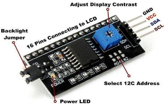 I2C Serial Interface Adapter Module for LCD: Due to limitedpinresourcesinamicrocontroller/microprocessor, controllinganLCDpanelcouldbetedious.SerialtoParallel adapterssuchastheI2Cserialinterfaceadaptermodulewith PCF8574chipmakestheworkeasywithjusttwopins.The serialinterfaceadaptercanbeconnectedtoa16x2LCDand providestwosignaloutputpins(SDAandSCL)whichcanbe usedtocommunicatewithanMCU/MPU