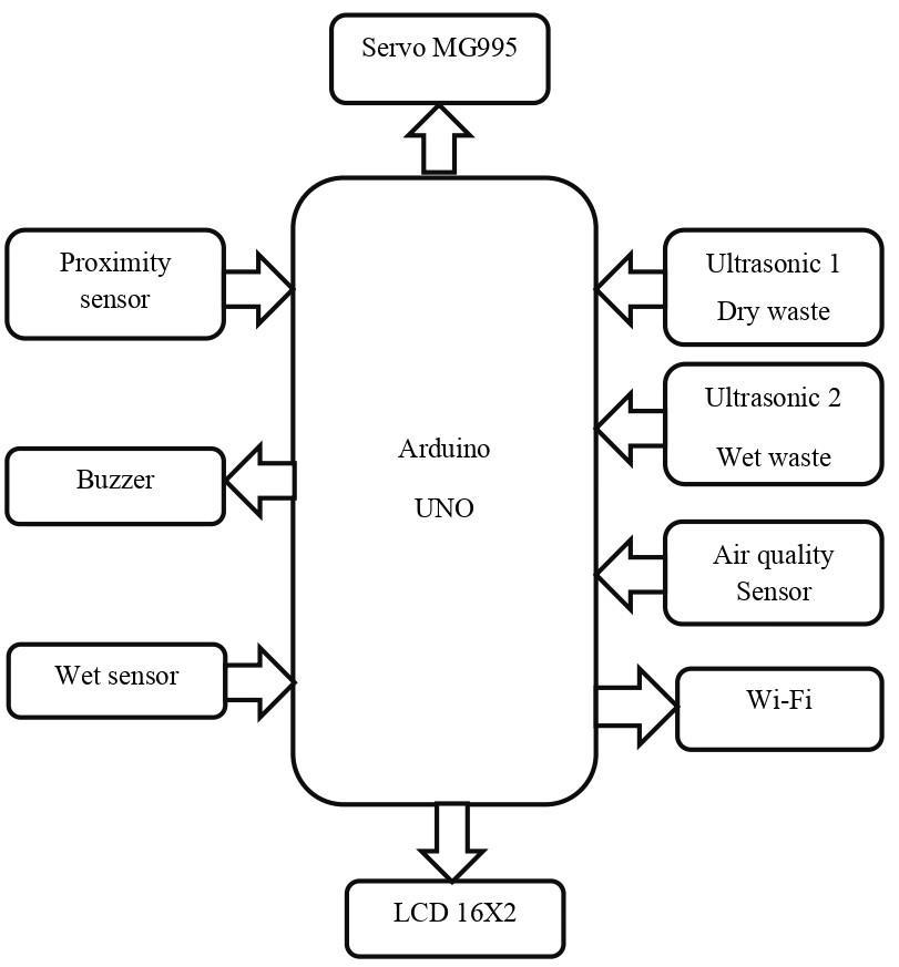Proximity sensor and Wet Sensors: proximitysensorsare utilizedfordetectingdrywaste,whilewetsensorsidentify wetwaste,facilitatingautomatedsegregation.