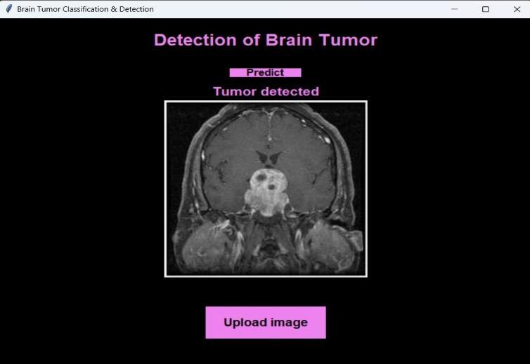 6) Result Display: The Brain Tumor Detection interface features user-friendly components to showcase classification results instantly. By clickingthe”UploadImage” button,userskickstart theanalysisprocedure.Afterward,whenusersclick on the” Predict” button, the system processes the uploaded image using a trained CNN model. Followingthisstep,the interface promptly reveals theclassificationoutcome, determining if a brain tumorisidentifiedornot.Thissmoothintegration of image upload, processing, and result presentation enriches the user experience and streamlinesdecision-makingformedicalexperts.
