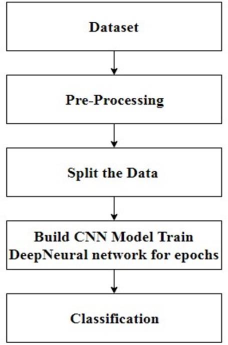 The system proposed comprises five main modules. Firstly, theDatasetmodule, then Pre-processing, followed bySplittingthedata,Buildingthe CNN model, training the DeepNeuralnetworkforepochs,andfinallyclassification.