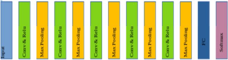 a) Each block consists of Conv2D layers, followed by Activation (ReLU), Batch Normalization, Max-Pooling2D, and Dropout.