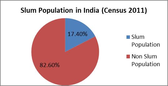 AsperCensus2011,atotalof65.49millionslumpopulation accounting for 13.9 million slum households have been enlistedinslumsof2613citiesortownsspreadacross31 States and Union Territories of India. The non-slum population was 311.61 million. The slum population constitutes17.4percentofthetotalurbanpopulationofall theIndianStatesandUnionTerritorieswhile82.6percentof the urban population was non-slum population as per Census2011.