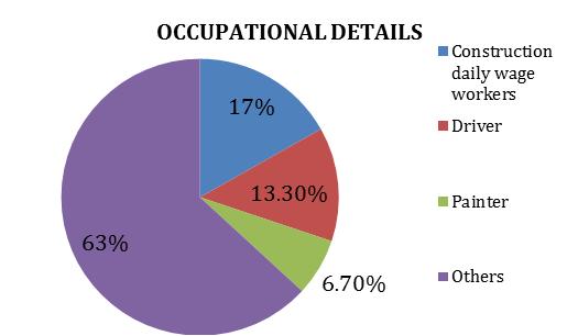 Theoccupationoftheslumdwellerswasfoundtobevaried. Nearlyhalfoftherespondentswereengagedindailywage jobs. The percentage of respondents engaged as constructionworker,driverandpainterwas17,13.4and6.7 respectively. Further,someofthemalerespondentswere workingassewageworker,welder,watersupplier,security guardandplumber.