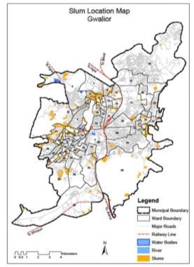 There are a total of 243 slums in the Gwalior Municipal Corporationaccountingforatotalpopulationof2.09lakhs as per Census 2011. A detailed statistics along with the locationsoftheslumshavebeenshownbelow.Withsucha high amount of slum population residing in the city, it becomesnecessarytostudytheissuesandworktowardsthe upgradationoftheslumsinthecity.