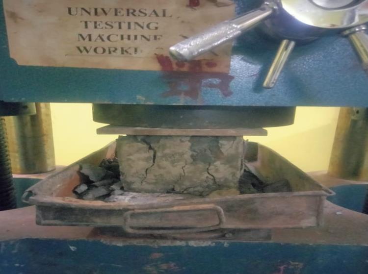 A 150 × 150 × 150 mm concrete sample was cast, and its compressivestrengthwasmeasuredafter7and28daysof testing.Itispossibletocomputethecompressivestrength usingequation(1).P/��equalscompressivestrength.Pisthe appliedload,andAisthecross-sectionalarea(150×150× 150mm).