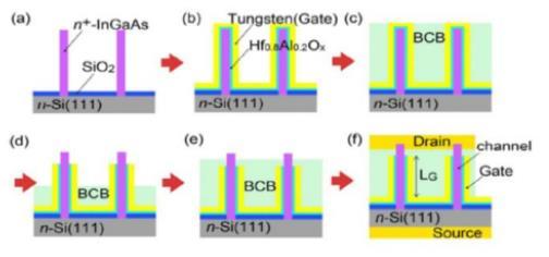 Fig. 3. Device fabrication processes: (a) InGaAs NW growth. (b) Atomic layer deposition of Hf0.8Al0.2Ox and sputtering of W-gate metal. (c) Spin-coating of BCB polymer. (d) RIE of BCB, gate oxide and W metal. (e) Spincoating of BCB and RIE etch back for electrical separation layerformation.(f)Drainandsourcemetalevaporation