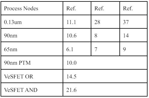 This table shows intrinsic voltage gain of the VeSFET compared to the MOSFET at different process nodes. The values of the above parameters propose that the VeSFET is superior to the MOSFET of the corresponding process node. A model use of the VeSFET based OTA is a high-precision current mirror. The best benefitoftheVeSFET, bethatasitmay,isthepresence of twoindependentgatescontrollingacommonchannel.The result voltage of this mirror is allowed to drop well beneath the immersion voltage of Mm2 in light of the fact that the current duplicating precision is ensured by identicaloperatingconditionsofbothtransistors.[9]