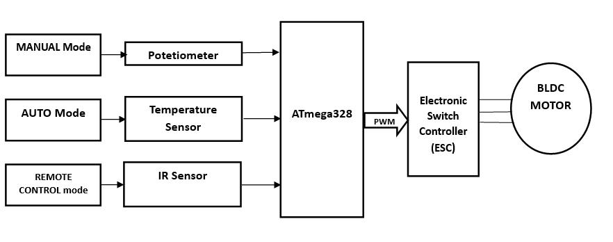 The model is implemented with three modes of working- manual mode, automatic mode and remote control mode. In manual mode, speed can be controlled by adjusting a potentiometer. In auto mode, speed is automatically controlled accordingtotheroomtemperaturewiththehelpofatemperaturesensorwherethesensorsensestheroomtemperature and compares it with the reference temperature. Speed is varied according to the difference between the two temperatures-reference and room temperatures. In remote control mode operation, speed can be adjusted by using a remotecontrollercontrolwithIRsensor