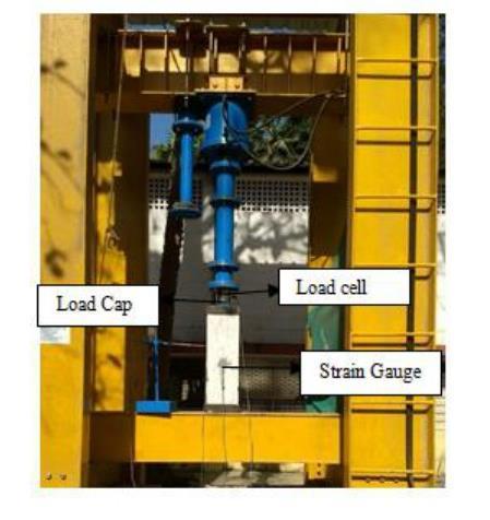 Thecolumnwasplacedsuchthatpositioningofthe loadcelloftheloadingframeisexactlytothecenterofthe topsurfaceofthecolumn.Twosteelcapswereprovidedat thetopandbottomendsofthecolumnsothattheyrestrict the spalling of the concrete during loading. Two Strain gaugeswereplacedeitherinverticalorhorizontalpositions at the center on any of the two sides. Gauge wire and connectorwiresoftheframeweresolderedandkeepthem inanundisturbedpositionandLVDTwasarrangedcarefully. Theprobeoftheloadingframewasconnectedtotheload cell. The loading frame with the test setup was shown in Figure5.