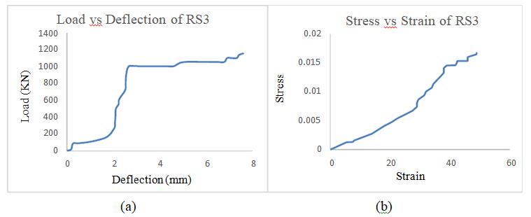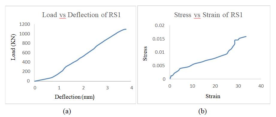 In the figure. 11(a), the load-deflection of retrofitted specimen-2havebeenshown.Deflectionstartedattheload of23.9KNandwaslinearlyincreasedwithadeflectionfrom 1.14mm to 3.34mm at an approximate constant load, and suddenly increased. The maximum deflection of the memberatanultimateloadof1158KNwasat5.02mm. ThedeflectionwasnotaslinearasRS1.