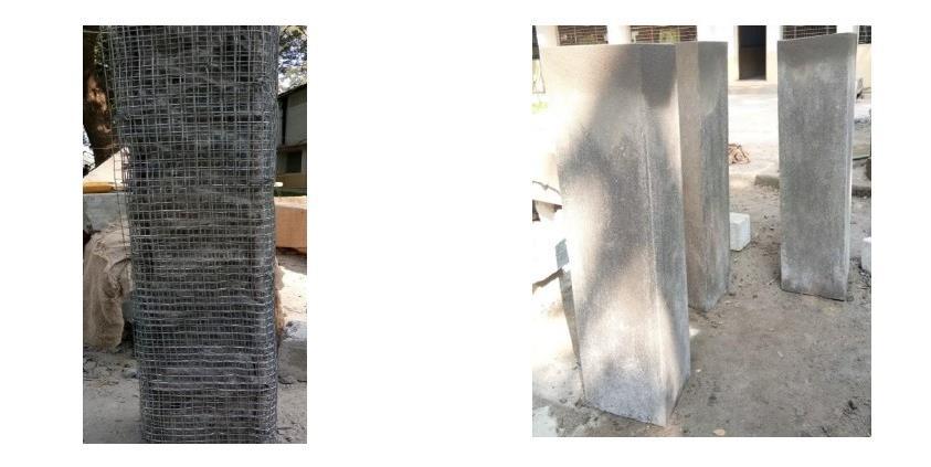 GI wire mesh was used in the steel jacketing techniquewithvariouspercentagesof25%,50%,and75% ofwiremeshbyreducinglongitudinalreinforcementdetails. Differentsizesofrebarwereusedsuchas12,10,and8mm diameters in each specimen as per design considerations. Afterthedurationofthe28-daycuringperiod,a20mmclear coverwaschippedbychippinghammer,andthen3,3.5,and 4 numbers of layers of wire mesh were wrapped with no gapsinbetweenthelayersaroundthesurfaceofthechipped areaofthespecimen.Tomakethemeshfirmitwastiedto the longitudinal reinforcement with bending wires. Plasteringwasdoneforthemeshedcolumnswitharatioof 1:2 as per the considerations. Duration of curing for retrofittedspecimenswas28days.