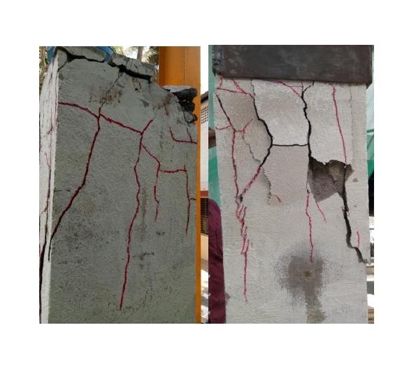 RS2 was provided with 50% of wire mesh with reduced longitudinalreinforcement.Stressconcentrationwashigher inthetopsectionascrackswerepassedtowardsthecenter due to repeated loadings. The behavior of the specimen duringtheloadingswasabouttobuckleasitexceededits compressivestrengthandthememberalmostenteredthe buckling stage. Comparatively, this refinement gave good strength and high bearing capacity as compared to the controlspecimenandRetrofittedspecimen1.