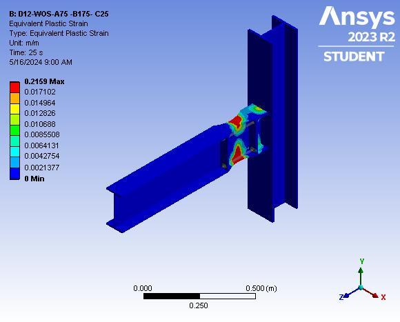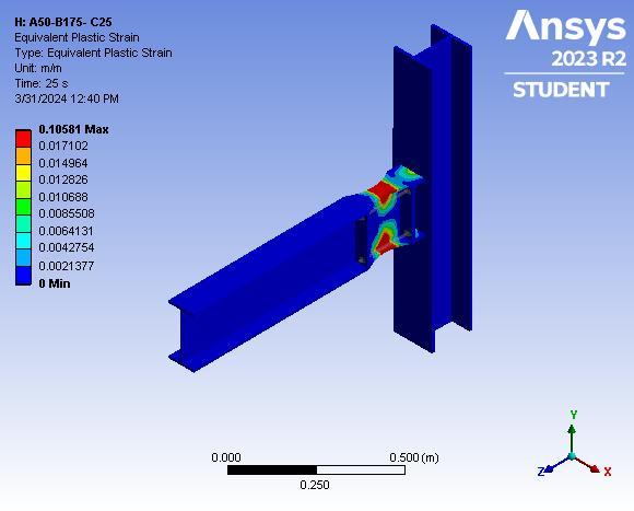 Theloadbearingcapacityvariesfromoneanother.Butitis observed that the plastic hinge is relocating from the RBS portion which is not acceptable. The model a50-b175-c25 is the best option as there is no plastic hinge relocation from the RBS portion. The load bearing capacity of a50b175-c25 is 73.76 KN with 26.62 percentage increase in strength than the model a50-b175-c25 without strengtheningwithadriftvalueof3%.