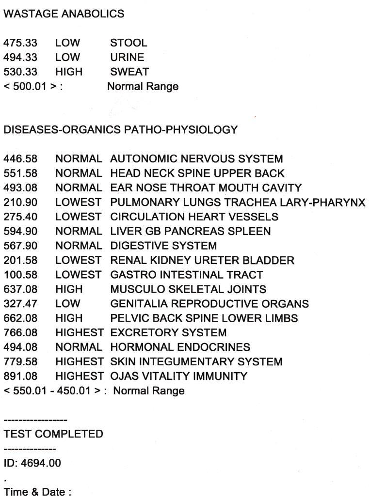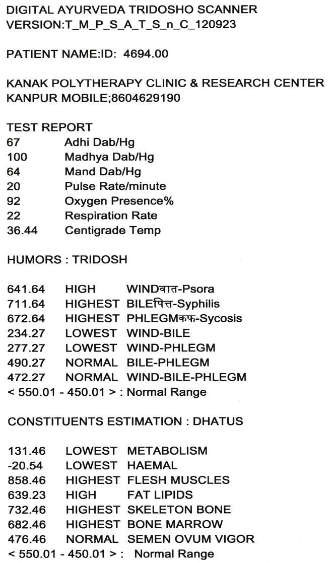 After the patient is examined, the machine synthesizes and analyzes the recorded data after a few minutes, assesses the principlesofAyurvedaandthelevelofdisordersprevalentinthepatient'sbody,andprintsitonthescreen.Bylookingatthe result of the test, the patient can be immediately told what problems he is facing and from the point of view of Ayurveda, whichofhisdoshasanddhatusareindistortedstate.Bylookingatthis,itcanbeascertainedthatthepersonforwhomthetest has been done is Apart from the principles of Ayurveda like Vata, Pitta, Kapha and Sapta Dhatus of Ayurveda, there are 16