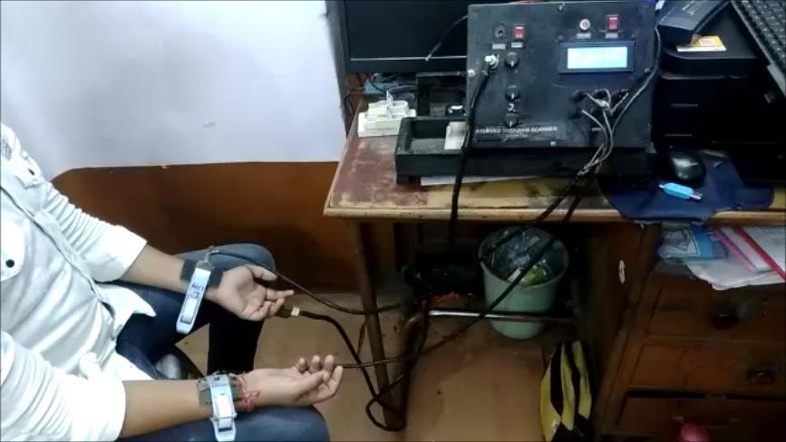 Torecordthepulsetestdatathroughthemachine,afterplacingthesensororelectrodeinthepatient'sbody,theswitchofthe machine is switched on and after this the process of recording through the machine starts. Recording is done from 1 to several times so that no point is missed. When this process is over, the machine automatically analyzes and synthesizes the recordeddataandimmediatelydisplaystheresultsonthescreentoknowwhatisthelevelofVata,Pitta,Kaphamixedwithits seventypes,sevenmetalsandthreestoolsinsidethebody.ispresent.Apartfromthese,thefunctioningof 16 systemsofthe body is analyzed and displayed on the screen. Its data goes into the memory and from there this data gets fed into the computeranda 2 pagereportisprintedbytheprinterandmadeahardcopy.Theentireproceduretakes 10 to 20 minutes,