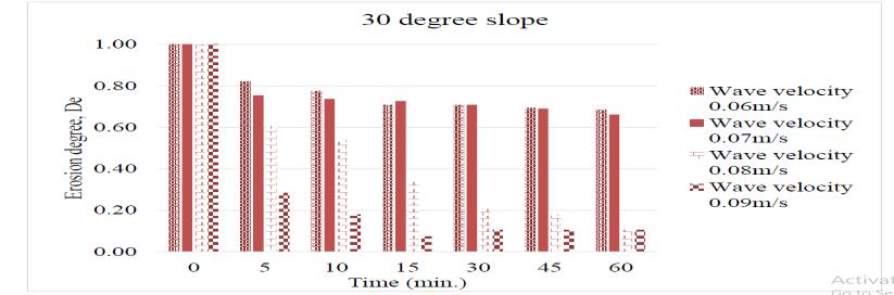 From Table 4.1, the extreme case is observed in velocity 0.09m/s after 15 minutes of wave action where the slope notedwasalmost2degrees,Erosiondegreeatthatpointis notedas0.07.After60minutesofexperiment,itisobserved that the erosion degree is reduced by almost 85%. The variationinErosiondegreeof30-degreeslopewithrespect tovariationintimeandvelocitiesareplottedinFig.4.1.