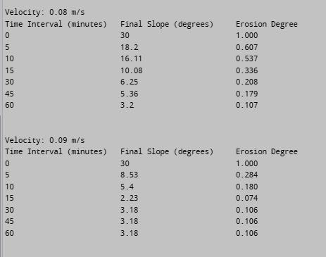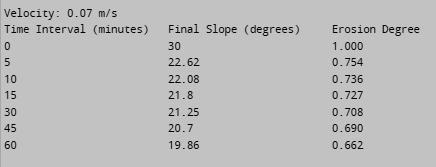 print("{:<25}{:<25}{:<20}".format("TimeInterval (minutes)","FinalSlope(degrees)","ErosionDegree")) forfinal_slope_degrees,time_intervalin zip(final_slopes_by_velocity[velocity], time_intervals_minutes_list):