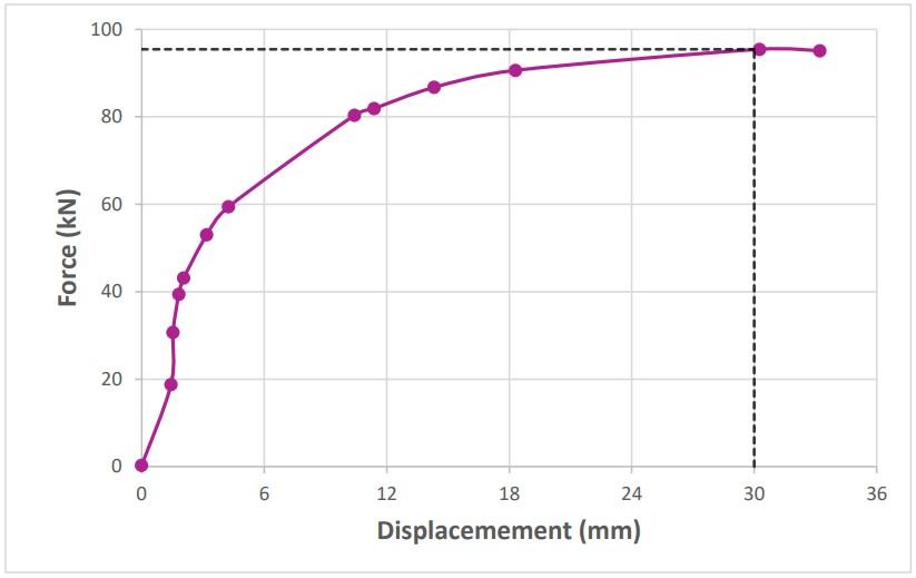 Fromtheabovechartithasbeennotedthatthemaximum load obtained is 95.4432 kN at a displacement of 30 mm respectively.