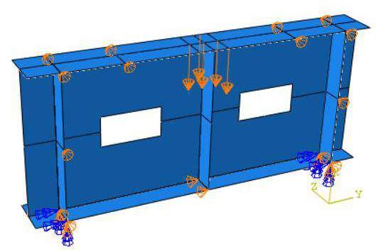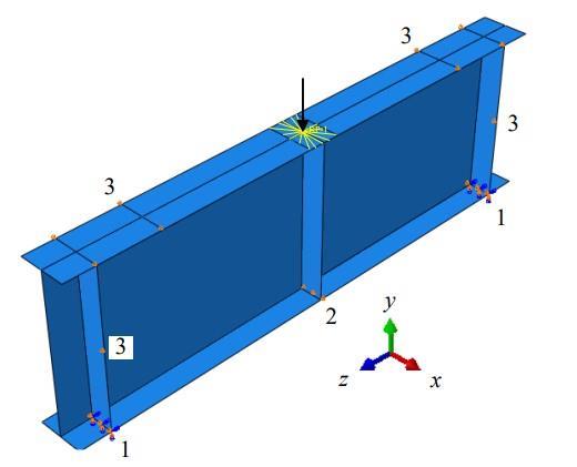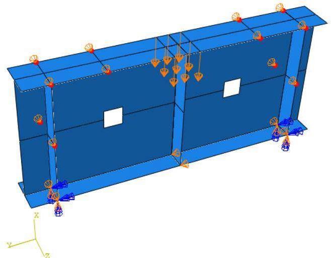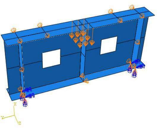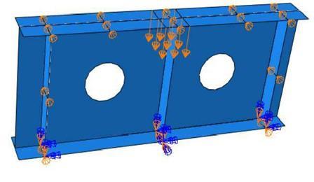 The model 1 is a hybrid plate girder with circular web openingofsmallerdiameter.Loadisappliedatthemidpoint asadisplacementloadof5mmandboundaryconditionis alsoapplied.