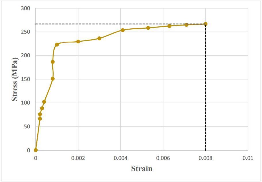 The maximum value of stress is approximately 266.7278 MPaatastrainof0.008.