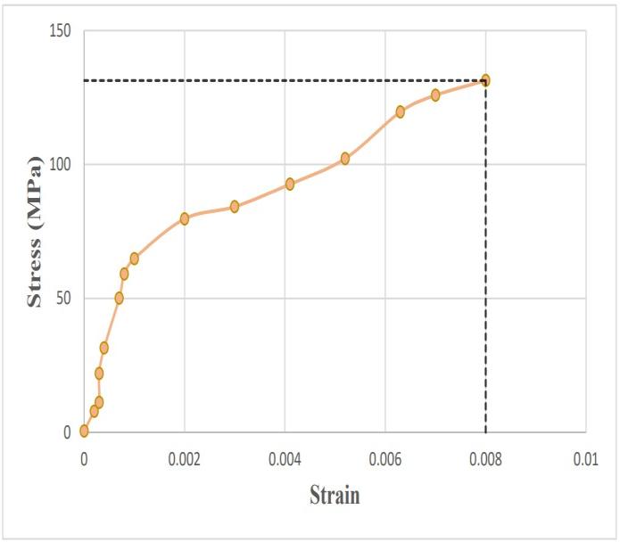 Themaximumvalueofstressisapproximately131.352MPa atastrainof0.008.