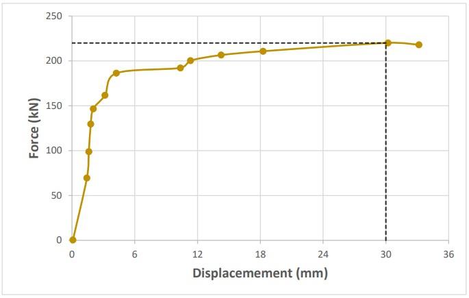 Fromtheabovechartithasbeennotedthatthemaximum loadobtainedis220.1444kN ata displacementof30mm respectively.
