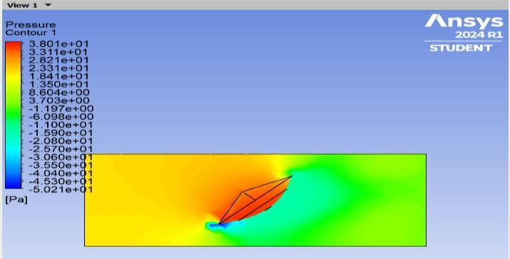 Inthewindanalysisofthedishantenna,detailedcontours were generated using ANSYS Fluent to visualize the distribution of wind forces exerted on the dish within the wind tunnel. These contours provide a comprehensive depictionofhowtheairflowinteractswiththesurfaceofthe dish,highlightingregionsofhighandlowpressure,aswellas areasofincreaseddragandlift.Byanalyzingthesecontours, valuableinsightsweregainedintotheaerodynamicbehavior ofthedishantenna,aidingintheassessmentofitsstructural integrityandperformanceundervaryingwindconditions. The figures below depict contour plots illustrating the variationinwindforcedistributionacrossthedishantenna atdifferentangularpositionswithinthewindtunnel.