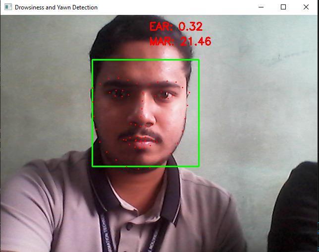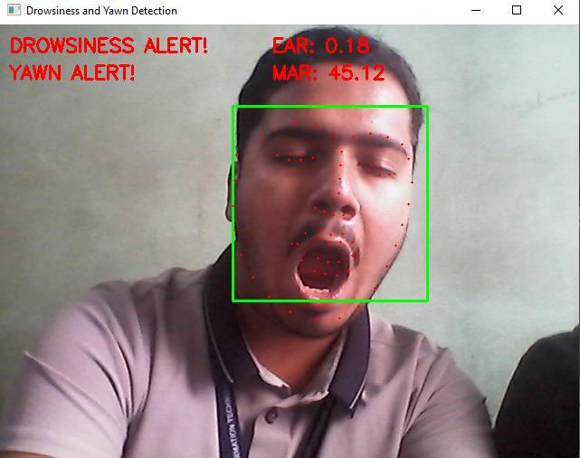 TheDrowsinessandYawnDetectionsystemusingfacial landmarks,leveragingthedliblibrary for facedetection and landmark prediction. The code utilizes various libraries, including OpenCV for computer vision tasks, dlib for facial analysis, and imutils for handling video streams. The playsound library is employed for playing alert sounds, and the time module is used for timerelated operations.