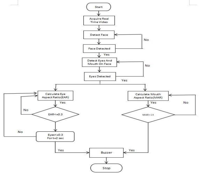 Feature Extraction : Open CV is employed for facial landmark detection, gaze estimation, and eye closure detection. Key facial features, such as eye aspect ratio (EAR)andmouthaspectratio(MAR),arecalculatedbased onthe detectedlandmarks. Thesefeaturesserveasinputs tothemachinelearningmodel.