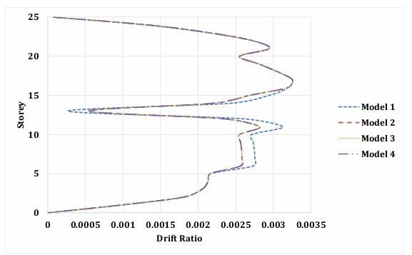 The drift ratio for a combination of serviceability loads is showninFigure12.Formodel4intheserviceabilityload combination,theminimumdriftratioisnoted