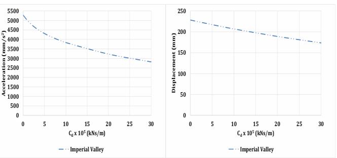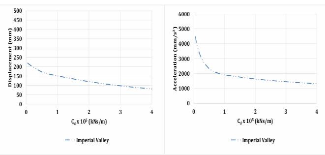 Thedampingcoefficient'svalueisdeterminedbyoptimizing it for almost constant acceleration and displacement. (Figures:-6(a)&6(b))respectivelyillustratetheeffectofCd onthereactioncharacteristicsof(Model3&Model4)under the Imperial Valley Earthquake. The displacement and accelerationoftheupperlevelaretakenintoaccounthere.It has been noted that when the value of Cd rises, response parameters fall. Regarding (Models 3 & 4), the damping coefficient'soptimalvalueis200000kNs/m