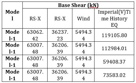 TheModel3conventionalframesystem,whichhas both SW and LVD at every storey for response spectrumandtimehistorystudy,exhibitstheleast amount of base shear. By comparing Model 3 to Model 1, the base shear reduction in time history analysisis50.12%.