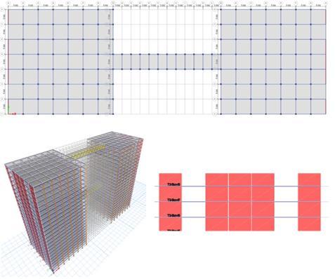 structuralcharacteristicsduringearthquakeswereassessed byZhou etal.(2016).Studieshavedemonstrated thatthe failure sequence of the structural elements was plausible and that the maximum interstory drift may meet the restrictions stipulated in the Chinese code. The natural periodsfoundinnumericalanalysisandshakingtabletests showed little differences. [17] An assessment of the coupling-control impact of a skybridge for nearby tall buildings was conducted by Lee et al. (2010). Based on numericalstudies,itwasdemonstratedthatthesky-bridge may reduce the dynamic reactions of the paired tall structures by efficiently increasing their damping ratio. It was also discovered that adding more viscous dampers mightgreatlyenhancethecoupling-controleffectoftheskybridge. [9] Mahmoudetal.(2015)investigatedtheseismic behaviorofthePetronasTwinTowersinMalaysia,whichare twoextremelytallstructuresconnectedbyaskybridge.The findings show that the total dynamic response of the connected towers in both longitudinal and transverse directionsisnotsignificantlyimpactedbythepositionofthe linking bridge. While the comparable storeys in the longitudinaldirection(x-direction)wereinsensitivetothe placementoftheconnectingbridge,theinter-story drift in the transverse direction (y-direction) demonstrated sensitivitytochangesinbridgelocation.