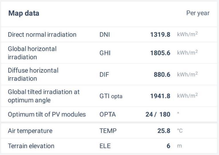 The most important parameter for a Solar PV plant is the Global Horizontal Irradiation.ThevalueofGHI onthesite location is 1805.6 kWh/m2, So the location has enough potentialforaPVsite.ThePVpotential fallsinthemiddle ground of the global scale. It can also be seen that the locationhasenoughspacetobuildaSolarPVpowerplant. ThePVOUTspecificofthelocationis1546.0kWh/kWp.