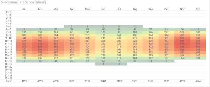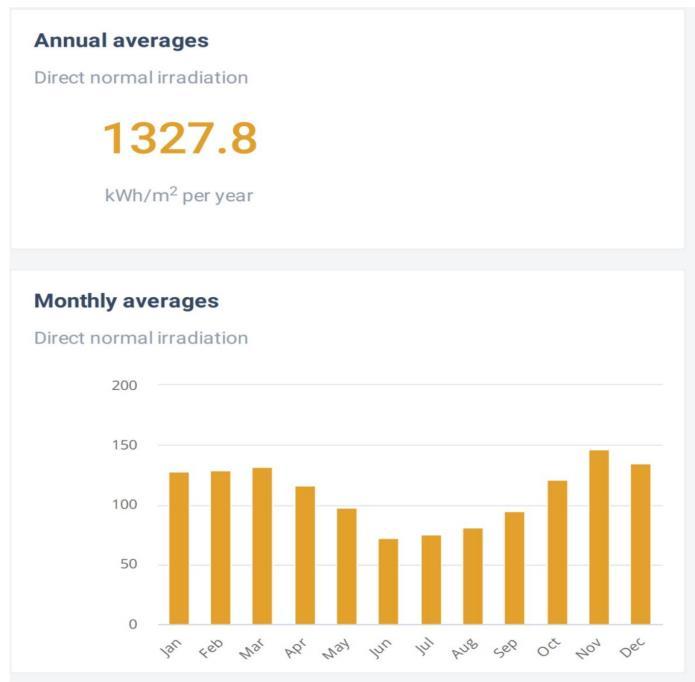 DNI is the degree of the sum of sun-oriented radiation transmitted by a surface that’s opposite to the sun’s coordinate way through the climate. DNI is required for CSP plant, so usually not a vital parameter for the Project. Thevalueofannual averageDNIis1327.8kWh/m2 which is not enough for a CSP plant. Point by point data with respect to the month-to-month average and hourly profile ofDNIcanbefoundinFig4