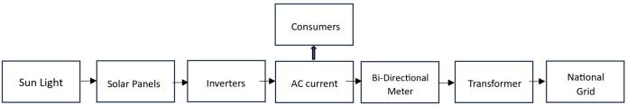 Thesystem’sfivemainpartsarethenationalelectricgrid, solarpanels,inverters,Bi-Directionalmeter,andACcircuit box. DC current is the form of power generated by solar panels.Then,aninverterwillbeusedtoconvertthistoAC power. The AC circuit box will receive this AC electricity. The circuit box is linked to AC loads or Consumers. The circuit box will also be linked to a Bi-directional meter, and the meter itself will be connected to the electric grid. Theelectricitysuppliedandfedintothegridismonitored bythismeter.