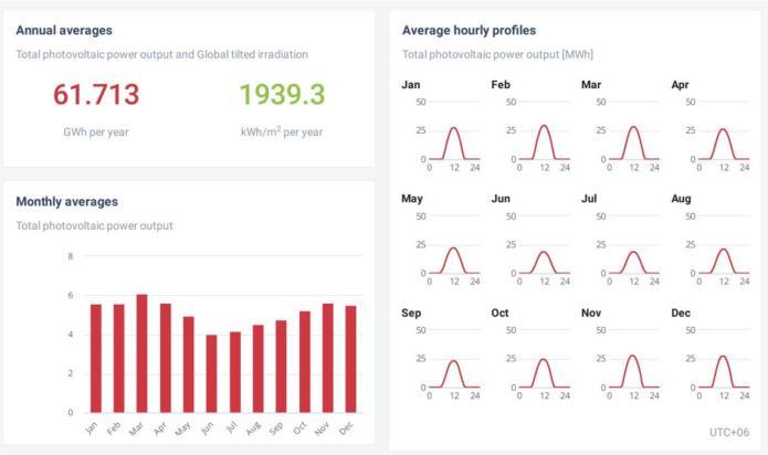 In Fig 6, The solar power system produces a total solar power output is 61.926 GWh per year and Global tilted irradiation is 1941.2 KWh/m2 per year. Monthly average profiles are also provided. Here February has the highest PV output. On the other hand, production in July is the lowest.