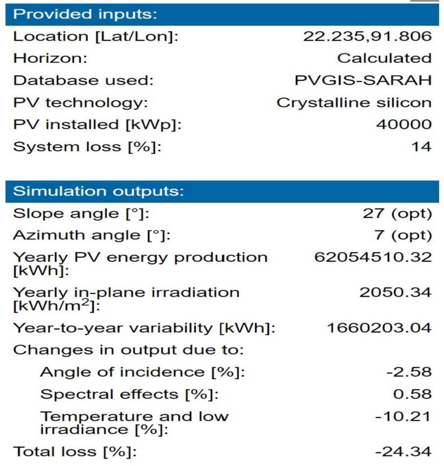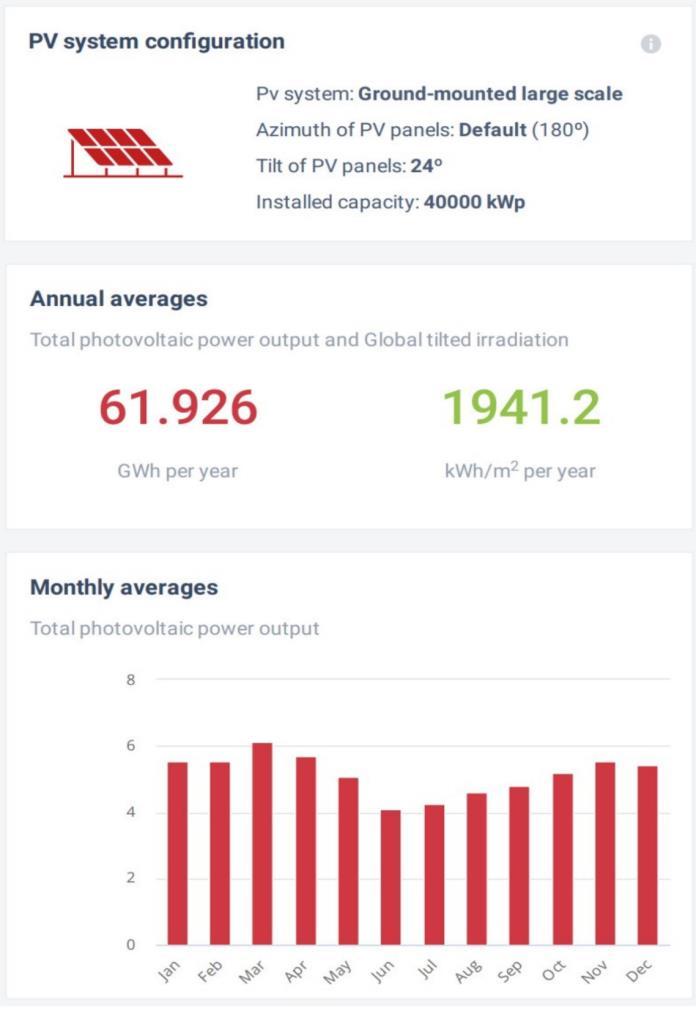 The Global Solar Atlas website is used to simulate the performance of the preliminary design. The tilt angle and azimuth angle are used to run the simulation. A 40000kWp(40MWp)ground mounted large scale PV systemischosen.SetupdetailscanbeseeninFig6