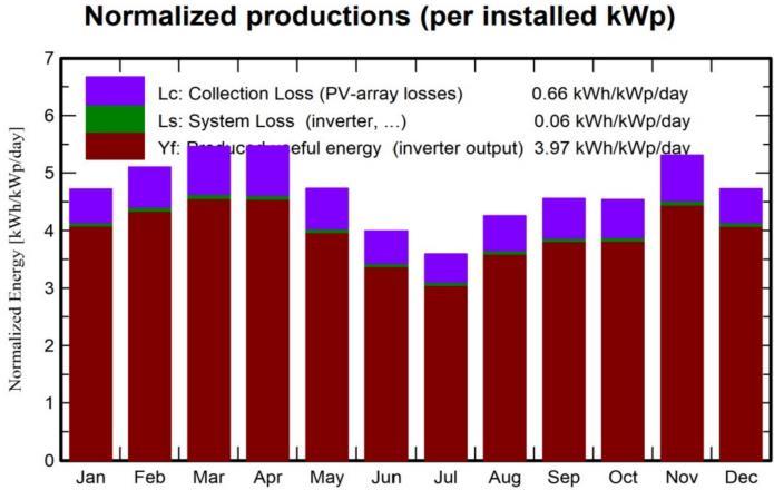 Fig 12 shows the normalized energy production distributedovertheyear.Thehighestenergyproductionis lessthan5kWh/kWp/dayandoccursfromApriltoMay.In contrast, the lowest production occurs in the winter from November to February, when the value exceeds 2 kWh/kWp/day. As shown in Figure 5.7, most PV module lossesoccurinMarch,November,andApril.Asseeninthis Fig 14 the PV system’s collection losses are 0.66 kWh/kWp/day and the losses for the inverter system are only0.06kWh/kWp/day.