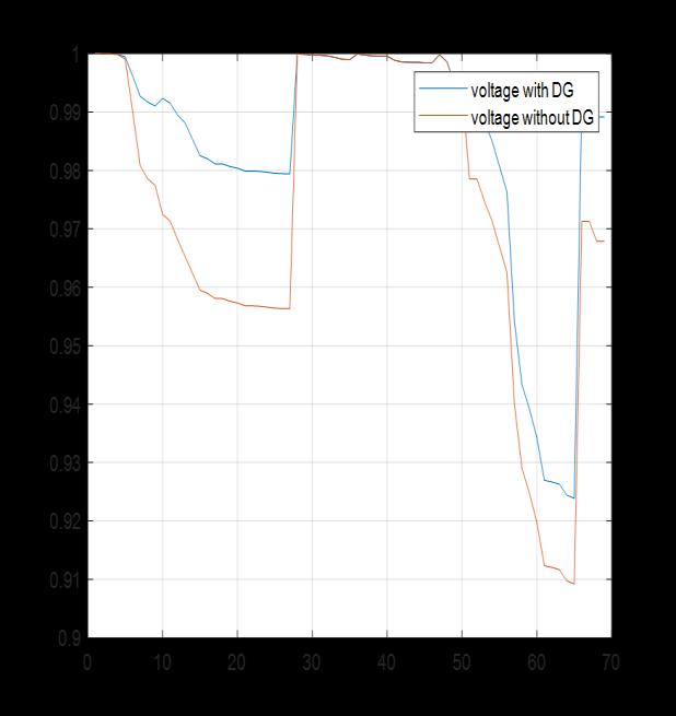 The obtained voltage magnitudes with and without DG placementofa69and33bussystemisshowninfig3and4. It is observed that is voltage profile enhances due to the placementofDG’s.