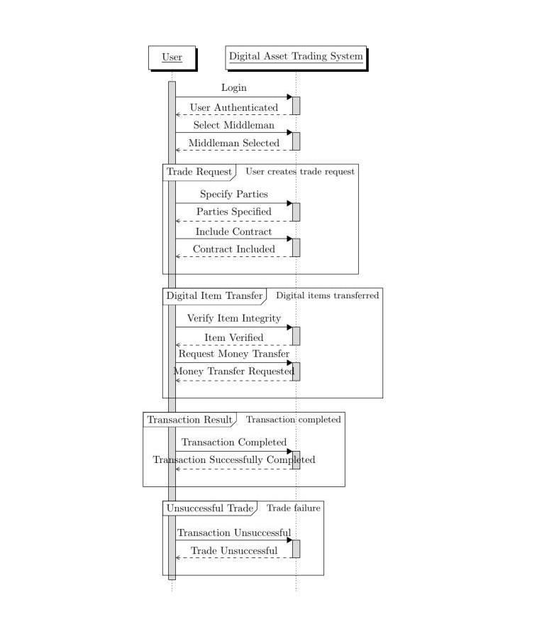In the System Architecture section, our digital asset trading platform's design is rooted in user empowerment, focusing on delivering an intuitive interface that ensures seamless tradingexperiences.Through theplatform,users have the freedom to select trusted intermediaries based on transparent reviews and activity, enhancing overall trust within the ecosystem. The use of blockchain-logged contracts further strengthens transparency and accountability, providing users with indisputable transactionrecords.[1]