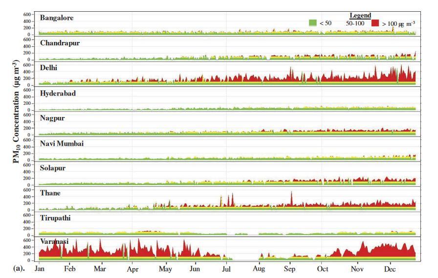 Figure 4 shows the daily PM10 concentration trend in 10 selected cities in India. In these selected cities, Varanasi, Delhi and Thane has high PM10 value of 261.92 μg/m3 186.83 μg/m3 and 132.51 μg/m3 respectively. Compared with these, other cities reported 48.26 and 98.79 μg/m3 PM10concentration Itwasalsofoundthatasmallcitylike Solapurisrecorded200μg/m3PM10concentrationbecause ofdustyatmosphereduetodryland[19]