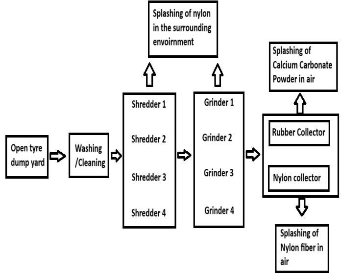 Figure2.showstheflowdiagramoftyrerecyclingprocess installedatGRP.Theusedtyresweredumpedintheopen storearea.Thenitwasbroughttowashingcenterandsentto primarycutters.Thecuttyrepiecesarefedtoshredderand thenitispassedontogrinderwherethenylonandrubber wereseparated.Theconveyorbeltwithmeshwereusedto separatethenylonandrubber.