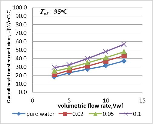 Atacertainvolumeflowrateof7.5LPMoverallheattransfer coefficientat95oCishigherthanthatof90oC,85oCand80oC by5%,25%and30%respectively.