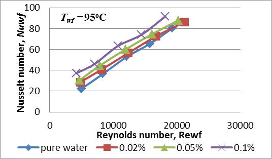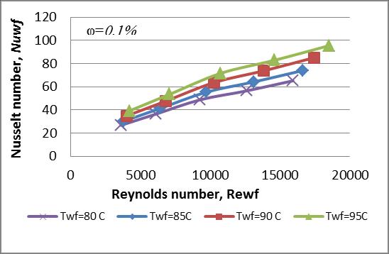 AtacertainReynoldsnumberof12,500Nusseltnumberat 95oCishigherthanthatof90oC,85oCand80oCby6%,25% and37.5%respectively.